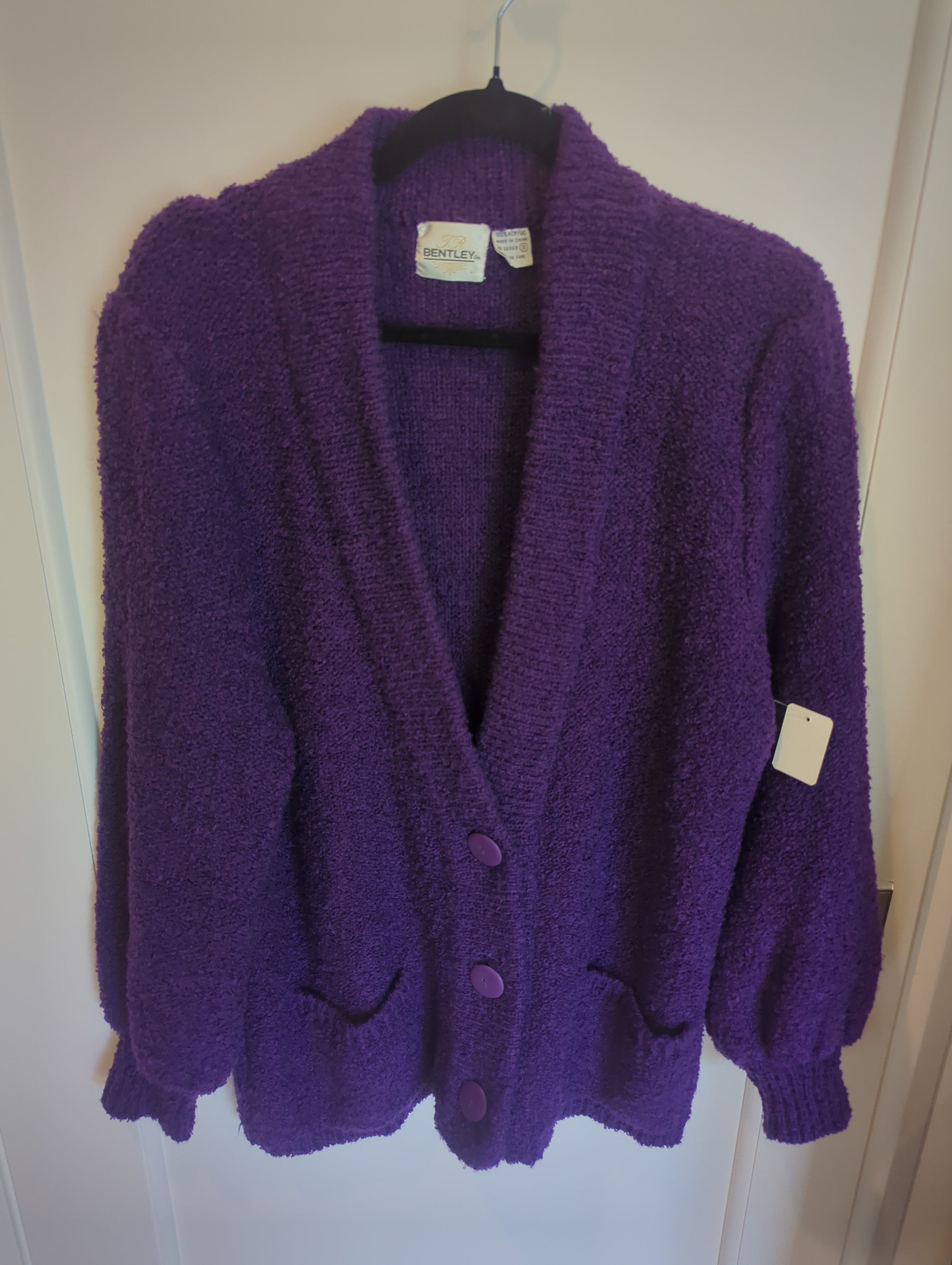 Classic 80's purple acrylic long sleeve cardi with drop button front and blouse sleeves. Runs large.