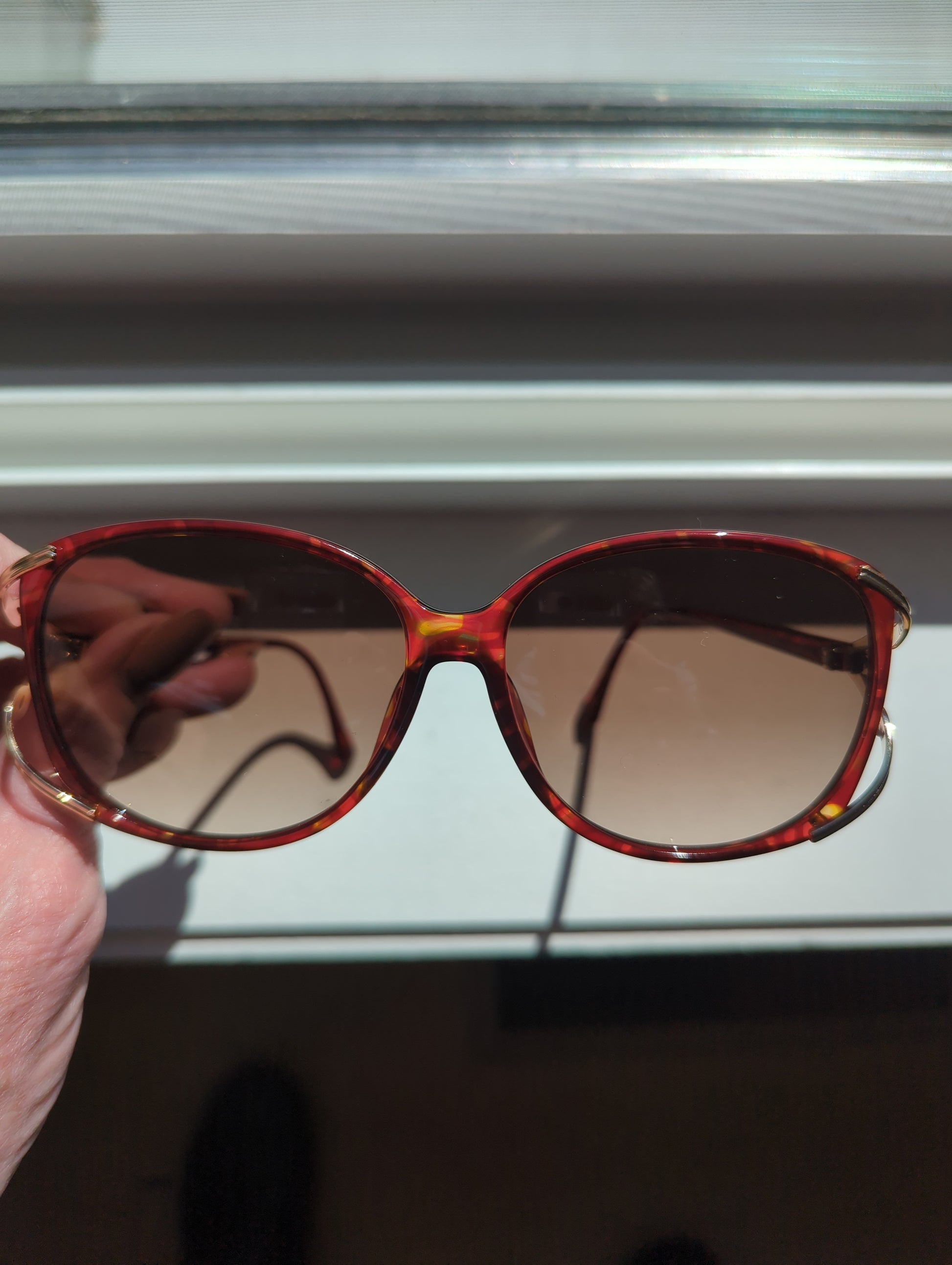Vintage 80's Christian Dior Optyl oversized "butterfly' sunnies. Carnelian red and gold tortoiseshell patter with gold attachments. Light brown single gradient lenses with no visible scratching and temples are in pristine condition. frames need an adjustment and in good overall condition.