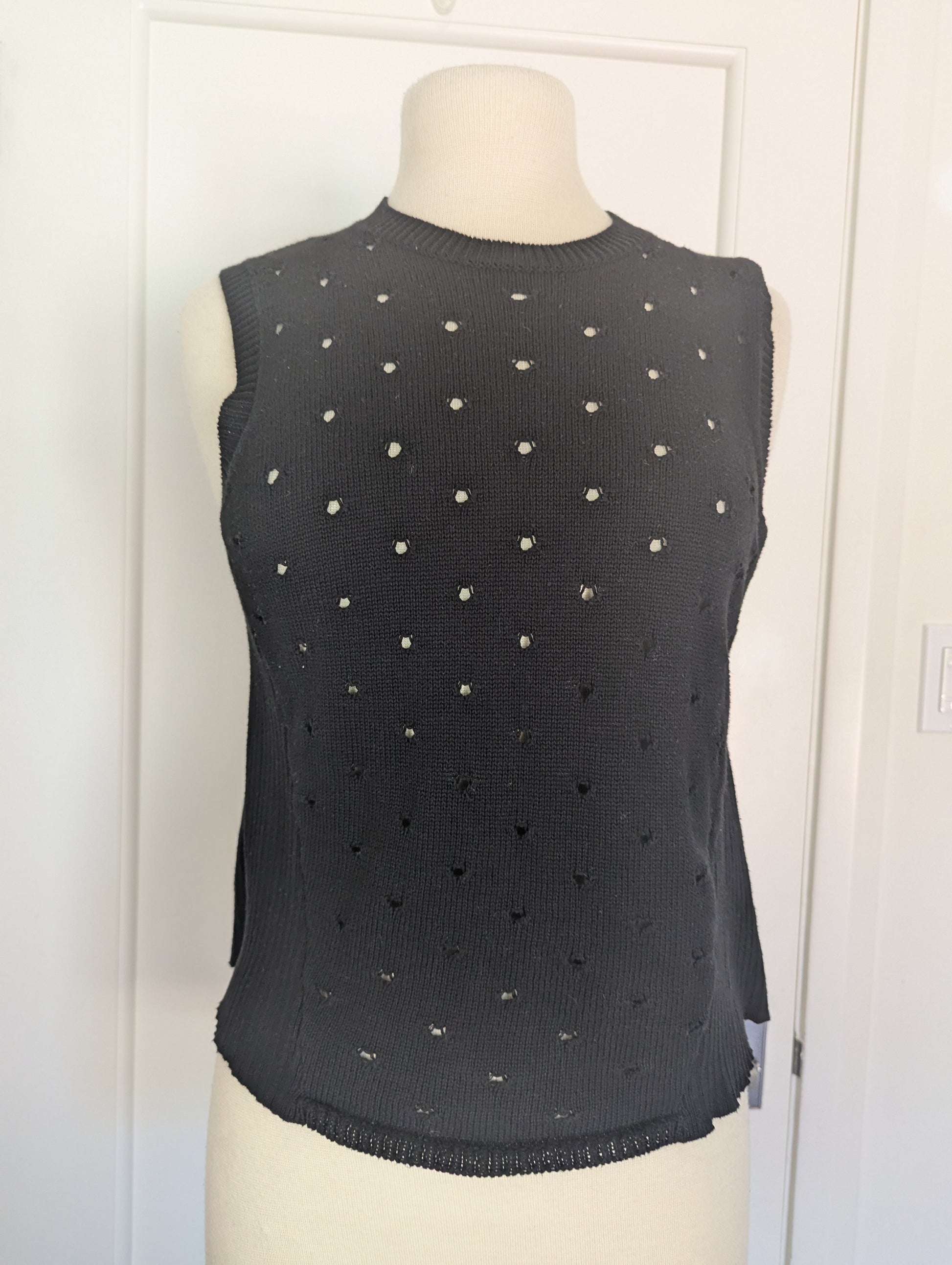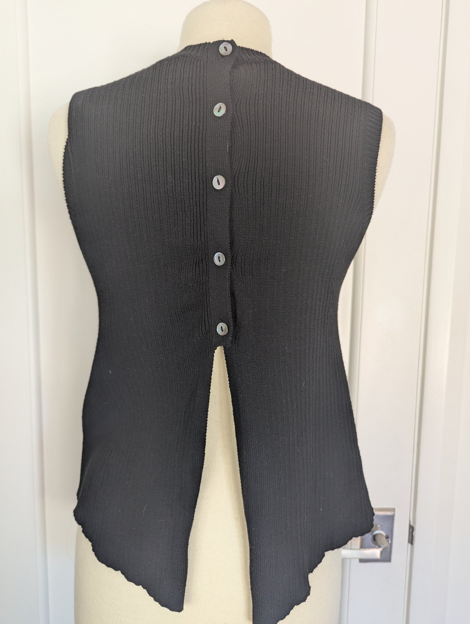 Super cool black sleeveless sweater from Autumn Cashmere. Front panel has a perforated detail and back is just as good with a button closure and open back.