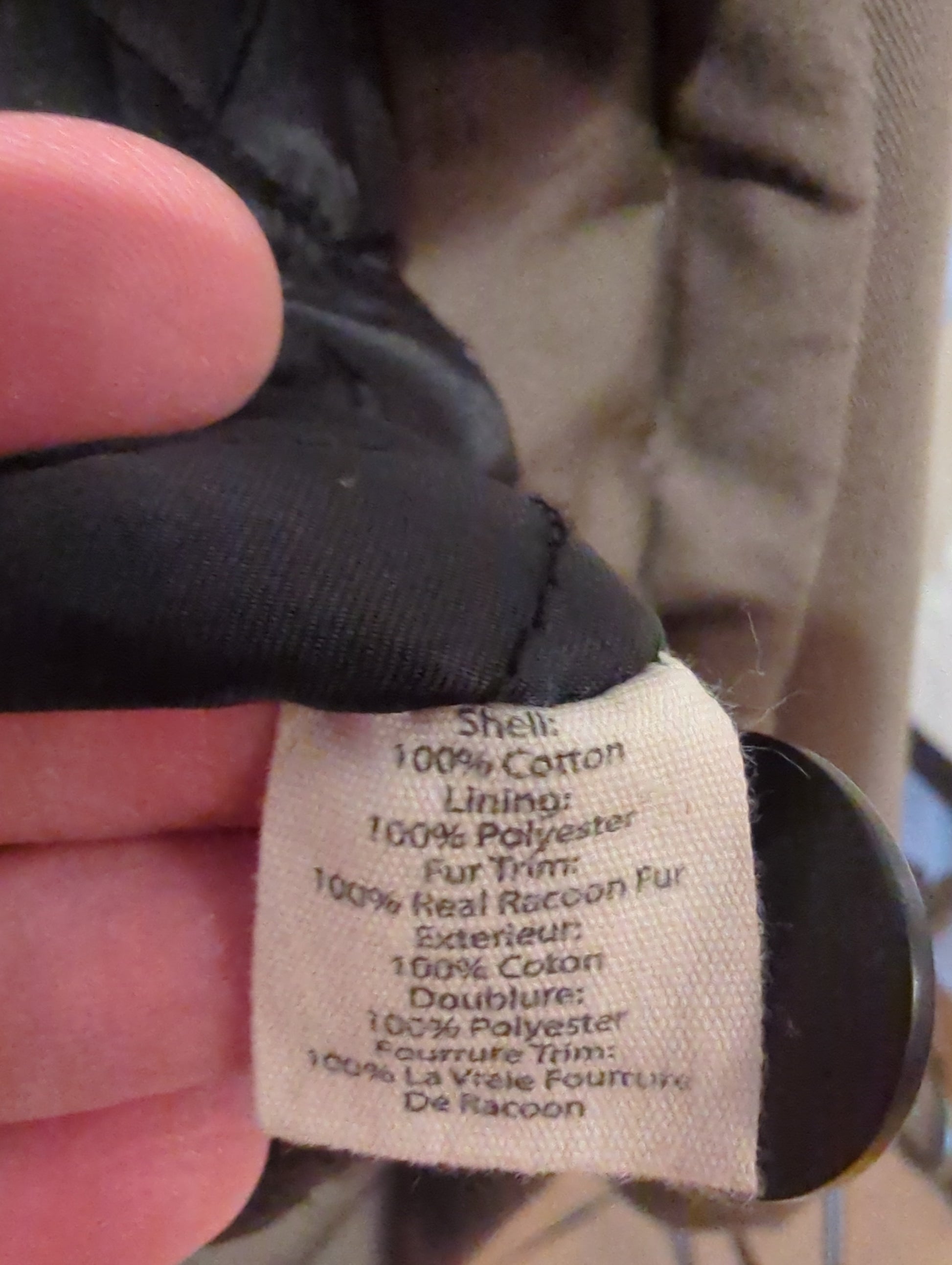 Fabric is Cotton with a polyester lining and removable raccoon fur trim along hood (can be snapped on/off). Deep kangaroo snap pockets in front and a drawstring waist and hem.