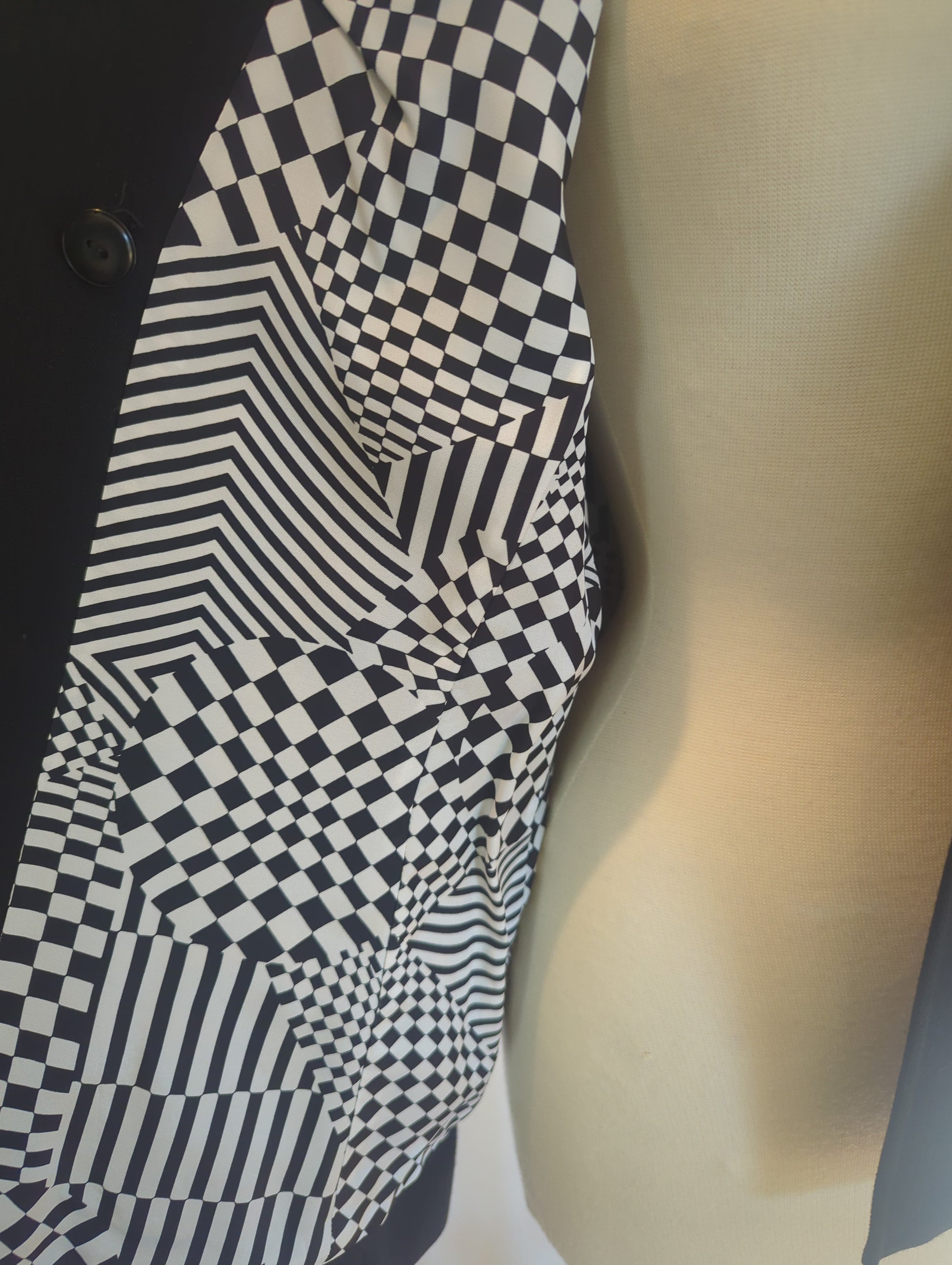 This fabulous vintage Crepe Escada Blazer has the MOST amazing liner - see photos! It is in pristine condition and the perfect weight for year-round wear. Classic double-breasted design with gold buttons, dual hip pockets and gold buttons on the sleeve.