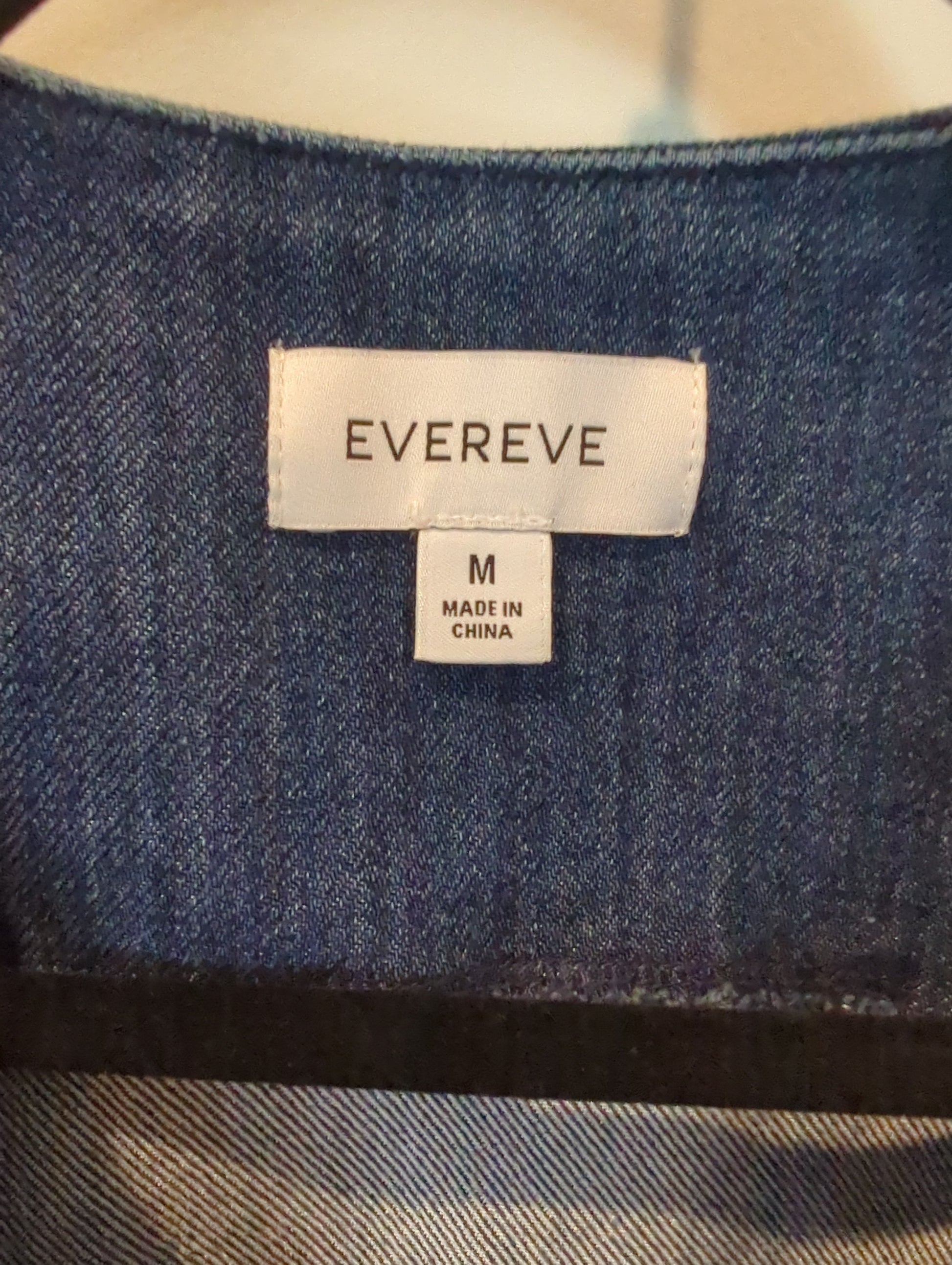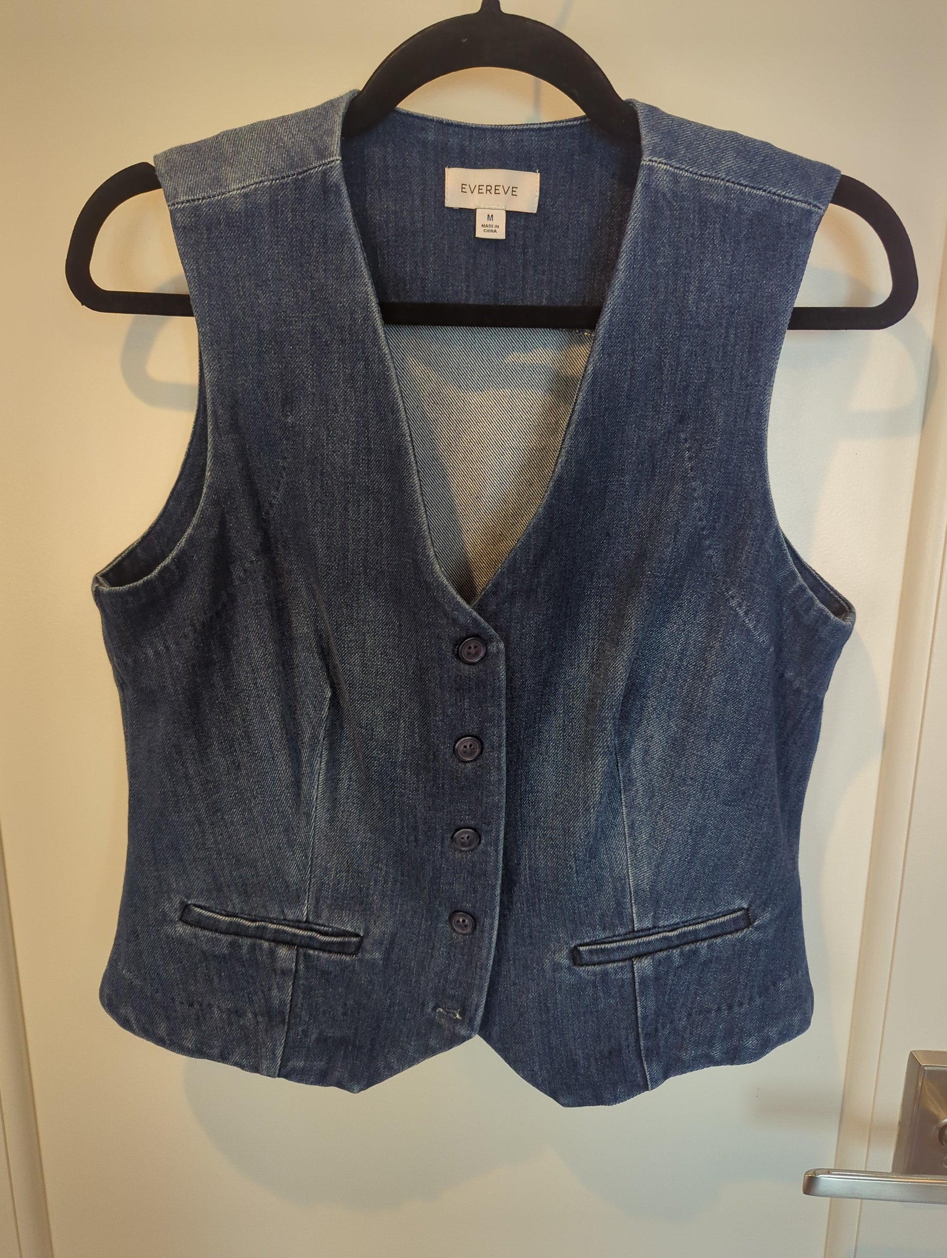 The Sierra Denim vest features a classic V-neck and button front closure in a medium blue wash. It's designed with a tailored fit and includes functional welt pockets at the waist. Offered at approximately %70m off original cost of $98.