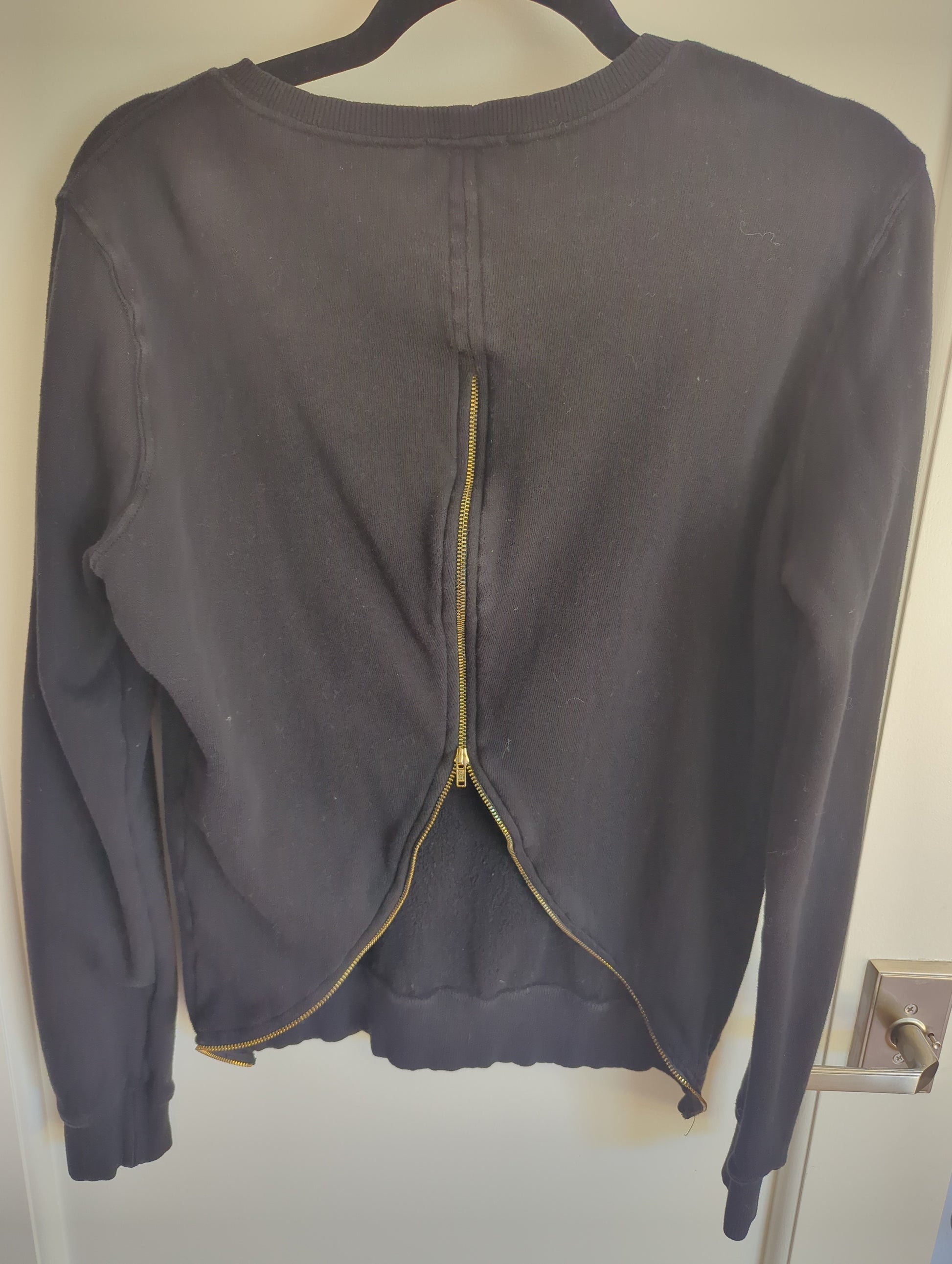 Black crew neck sweatshirt, long sleeve, with gold zipper back.