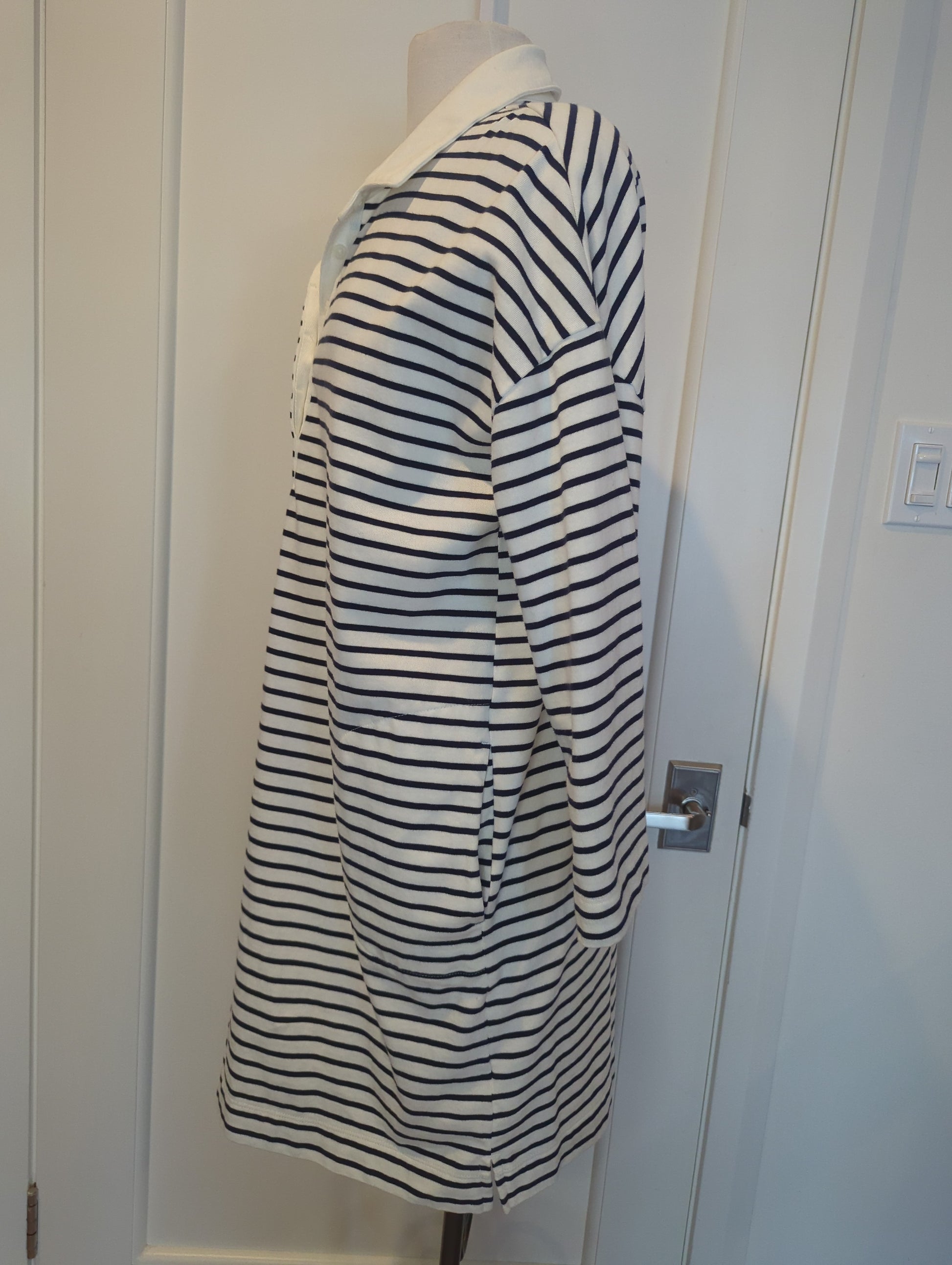 Cute polo style dress by Free Assembly in white with navy stripes. Collar and five button front placket. Dual pockets at side seams, long sleeves and a notched hemline.