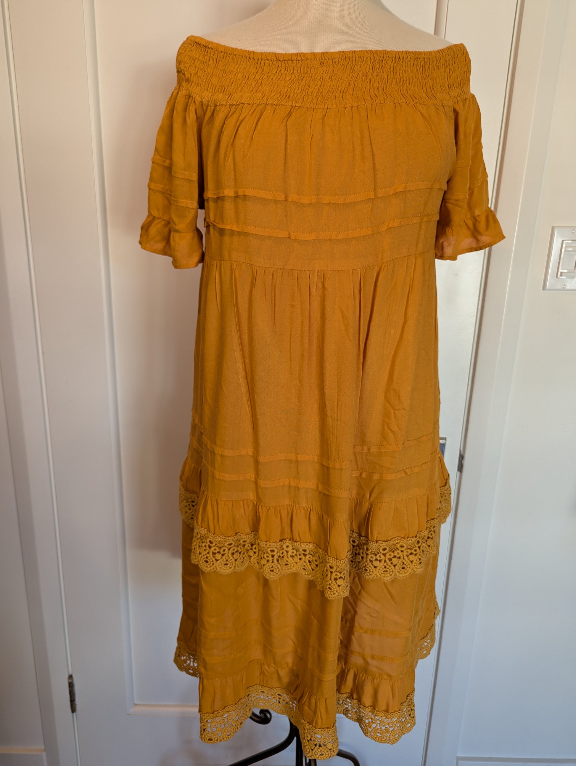 Layered swing dress in turmeric with crochet trim along ruffle hems. Smocked and can be worn off the shoulder.
