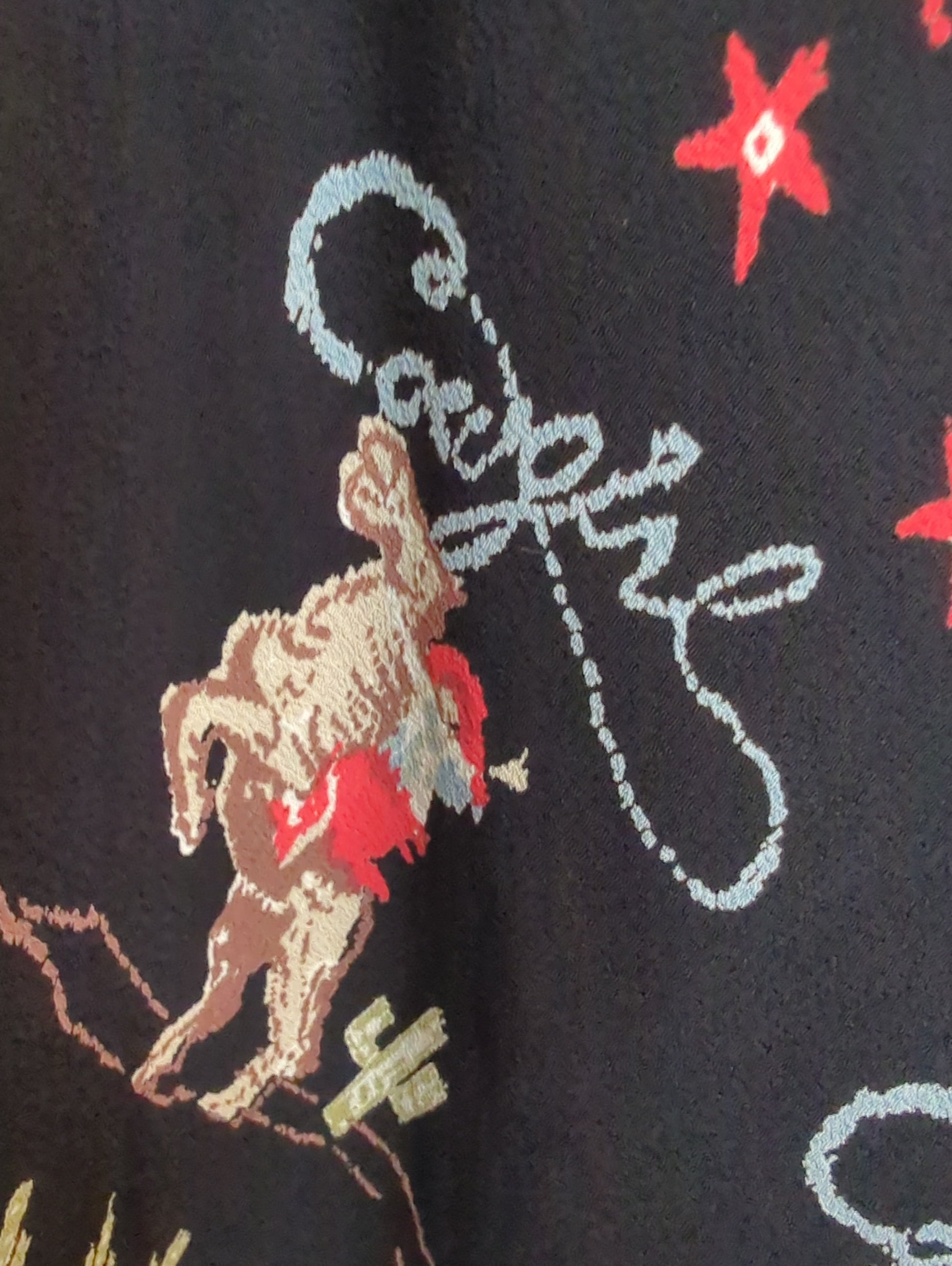Super cute Cowgirl skirt with graphic that mimics embroidery. Bias cut, ruffled hem, elastic waist.