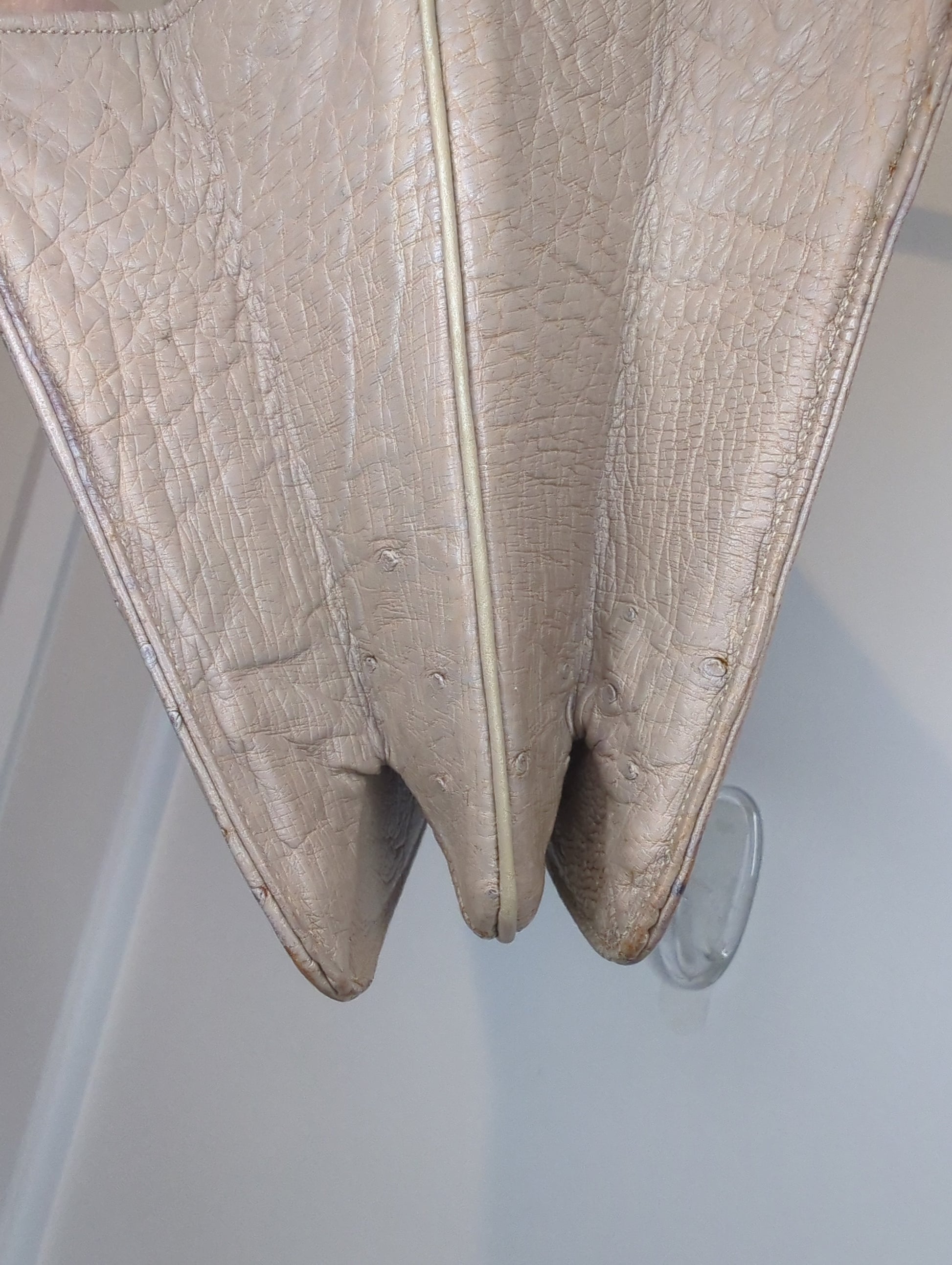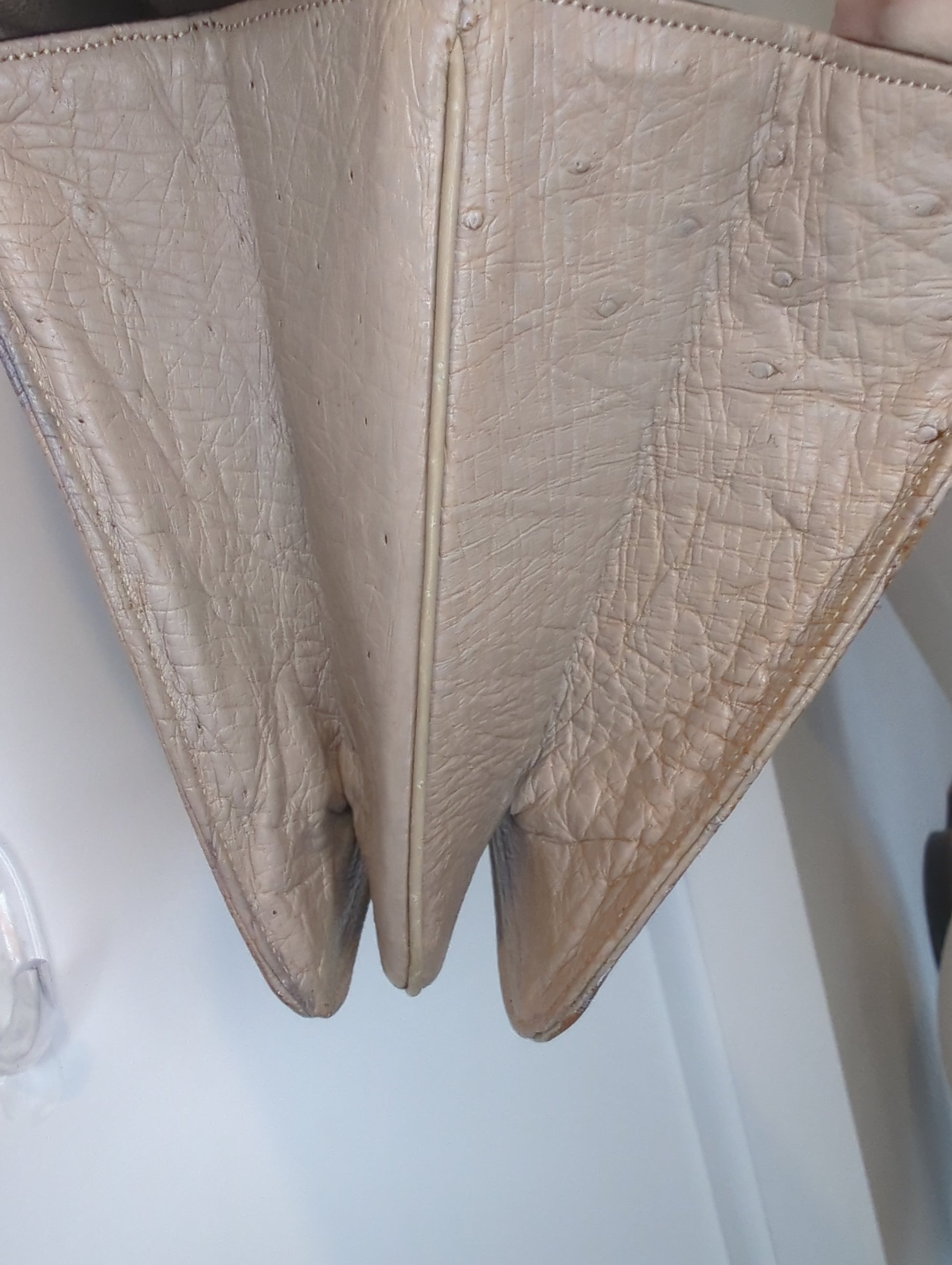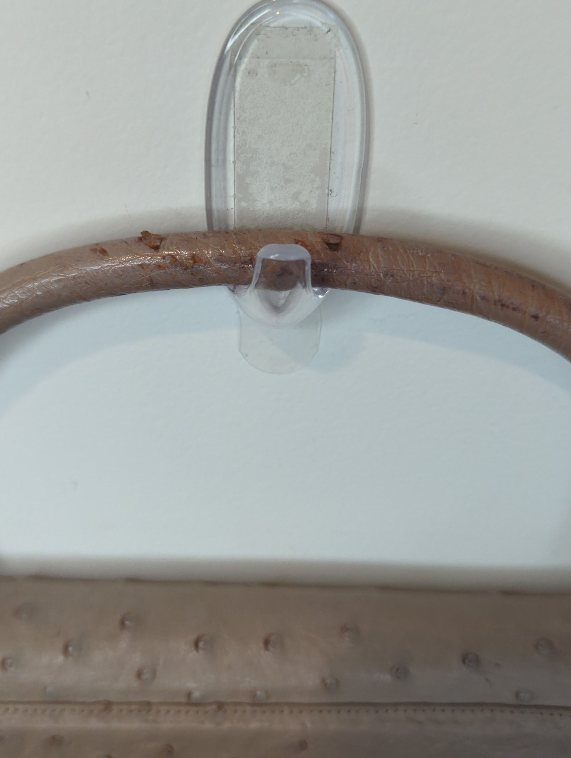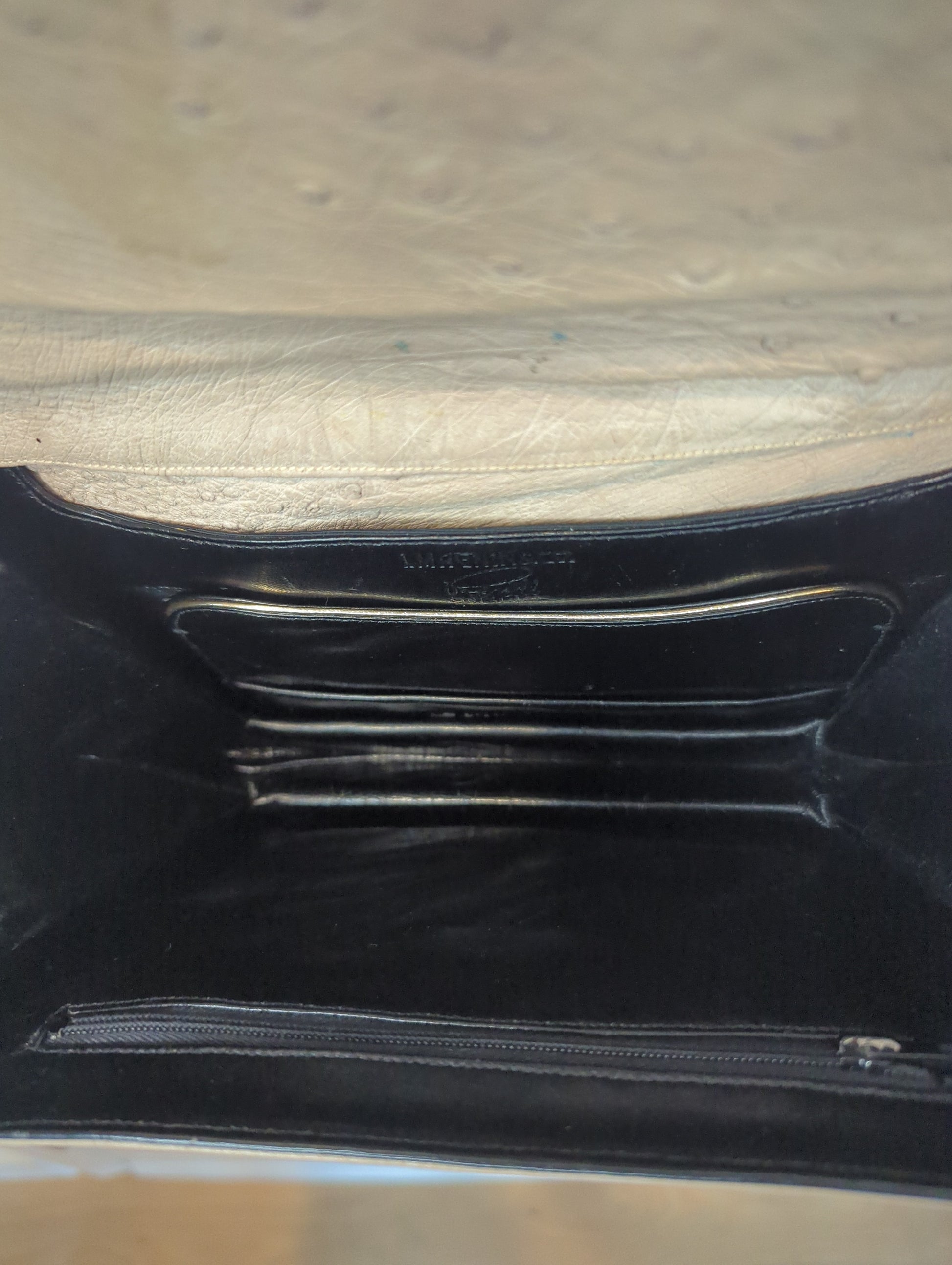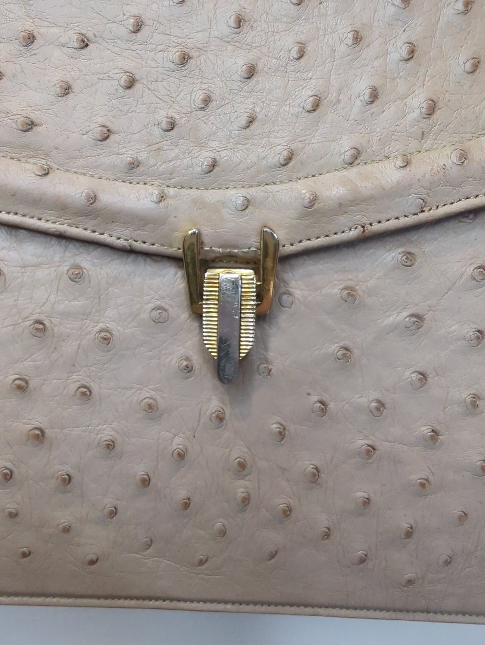 This exquisite vintage handbag from Rendl Original was made in the USA for I Magnin & Co. Circa 1950s-1960s and is in excellent vintage condition with a beautiful soft patina. This bag is a beautiful example of a classic style showcasing the elegance of the genuine ostrich leather with its distinctive quill pattern and buttery-smooth texture in a neutral light taupe color.