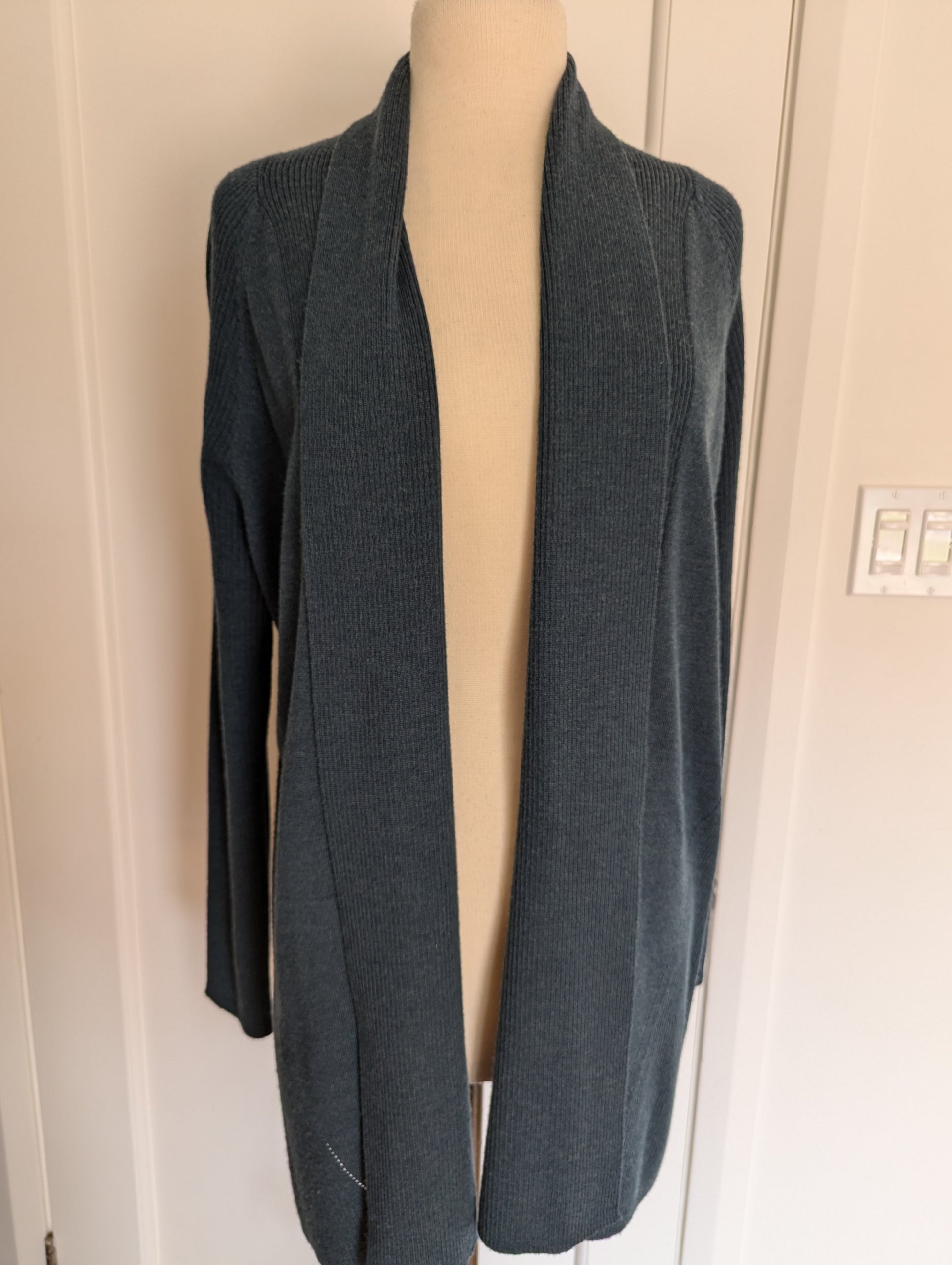 Beautiful open front, cardigan from Repeat in a dark Teal. Fine knit with ribbed pattern. Pre-loved, in very good condition.