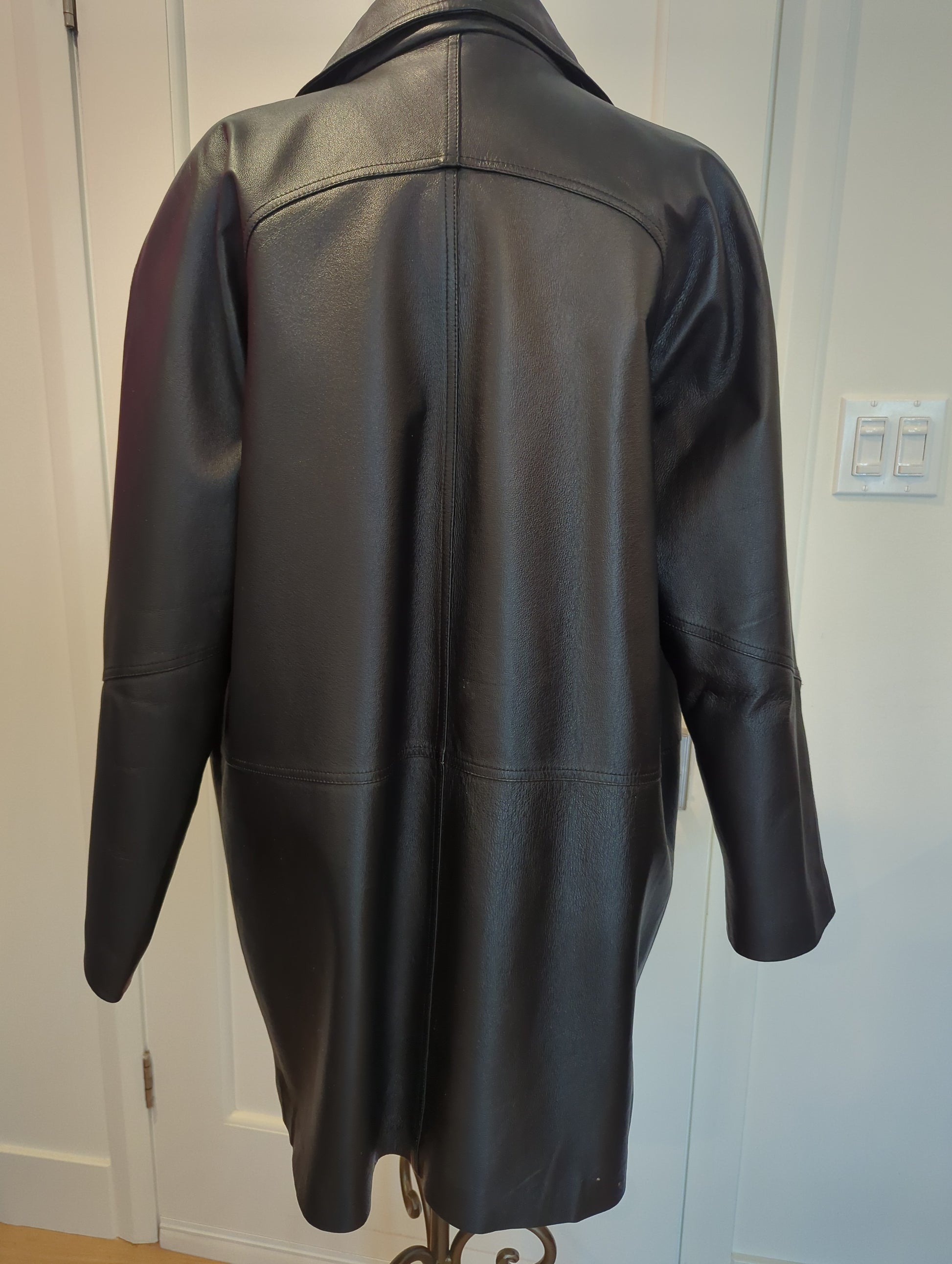 AMAZING Vintage black leather jacket. This jacket is in great shape with minimal signs of wear. No scratches or marring of the leather, the original leather buttons intact and the lining is pristine with no stains or tears. Mid thigh length, notched collar, raglan sleeves and front pockets.