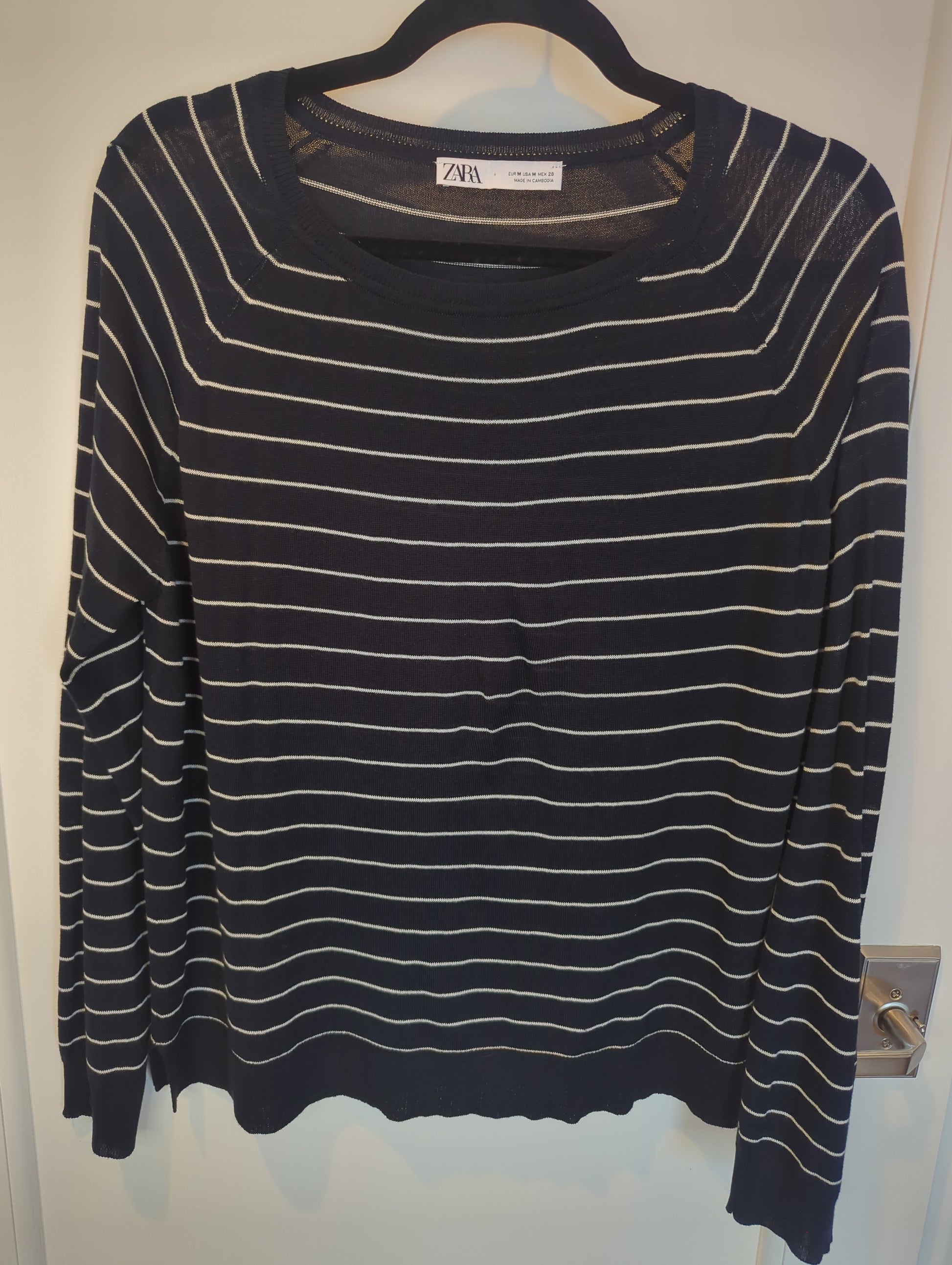 This lightweight sweater from Zara is the perfect layering piece for spring. Black with small white stripes, round neck and long sleeves. Oversized fit.